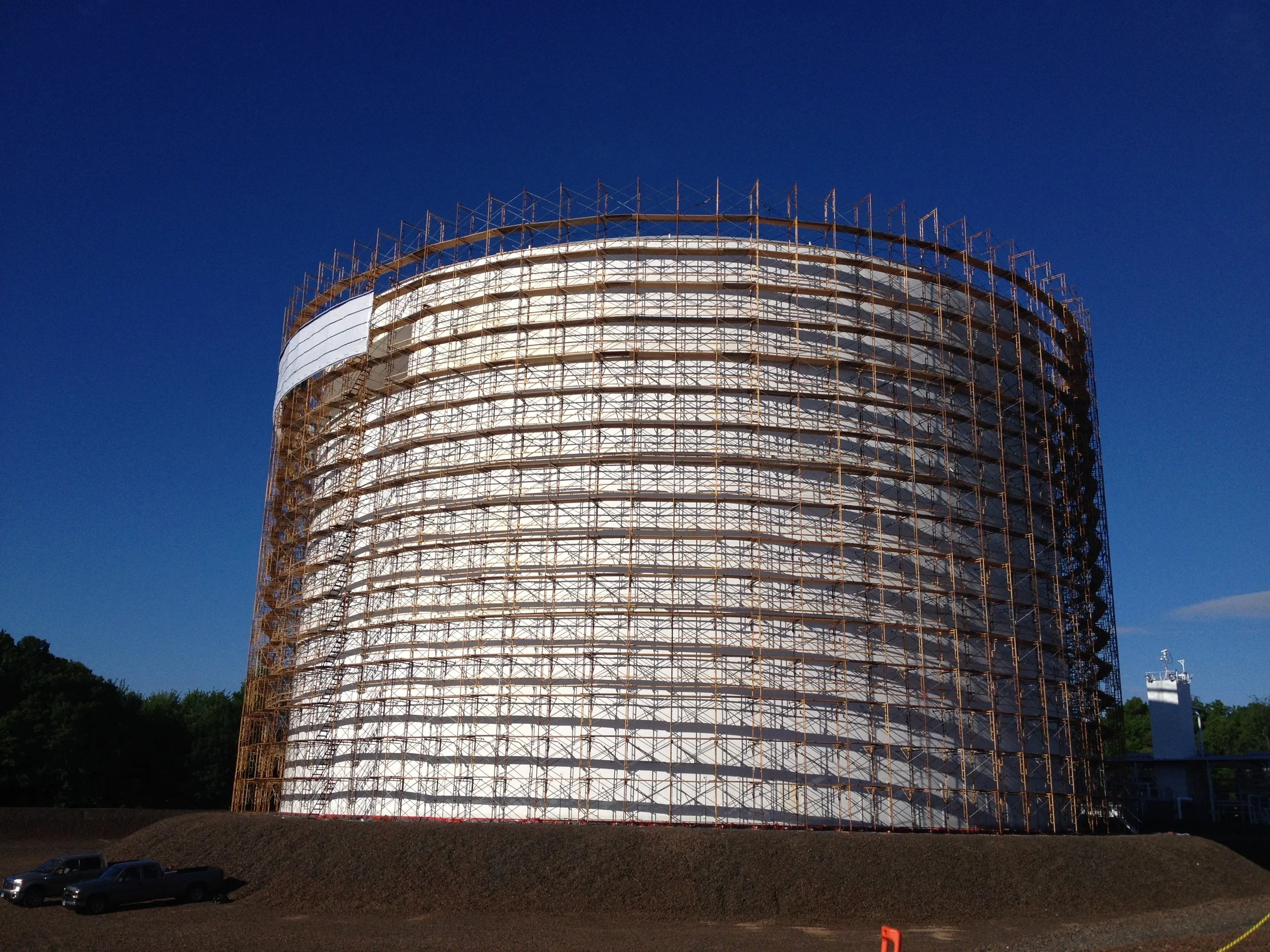 Yankee Ingenuity at Work - Yankee technicians removing asbestos coating from a 350’ - high chimney utlizing 40,000 psi water jetting with vacuum shrouded collection at a coal-fired power plant tower in western NY